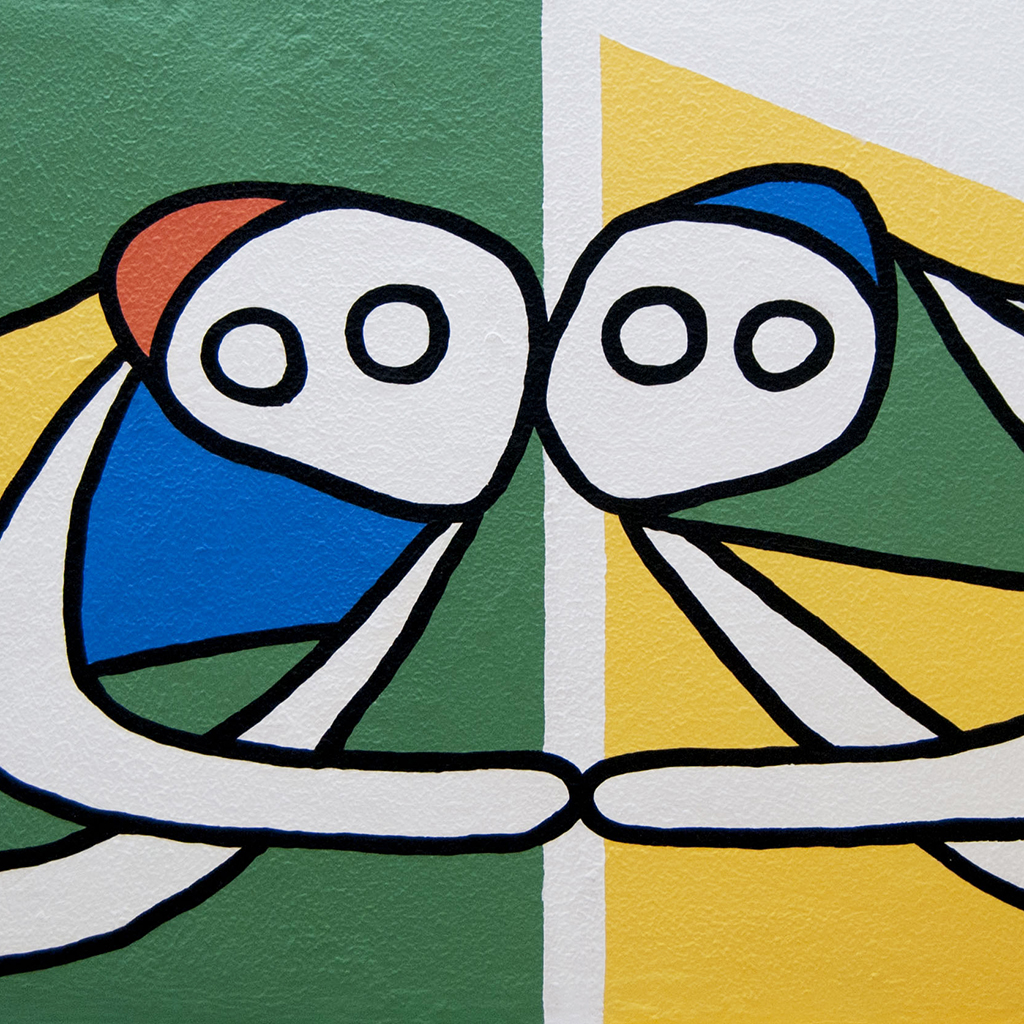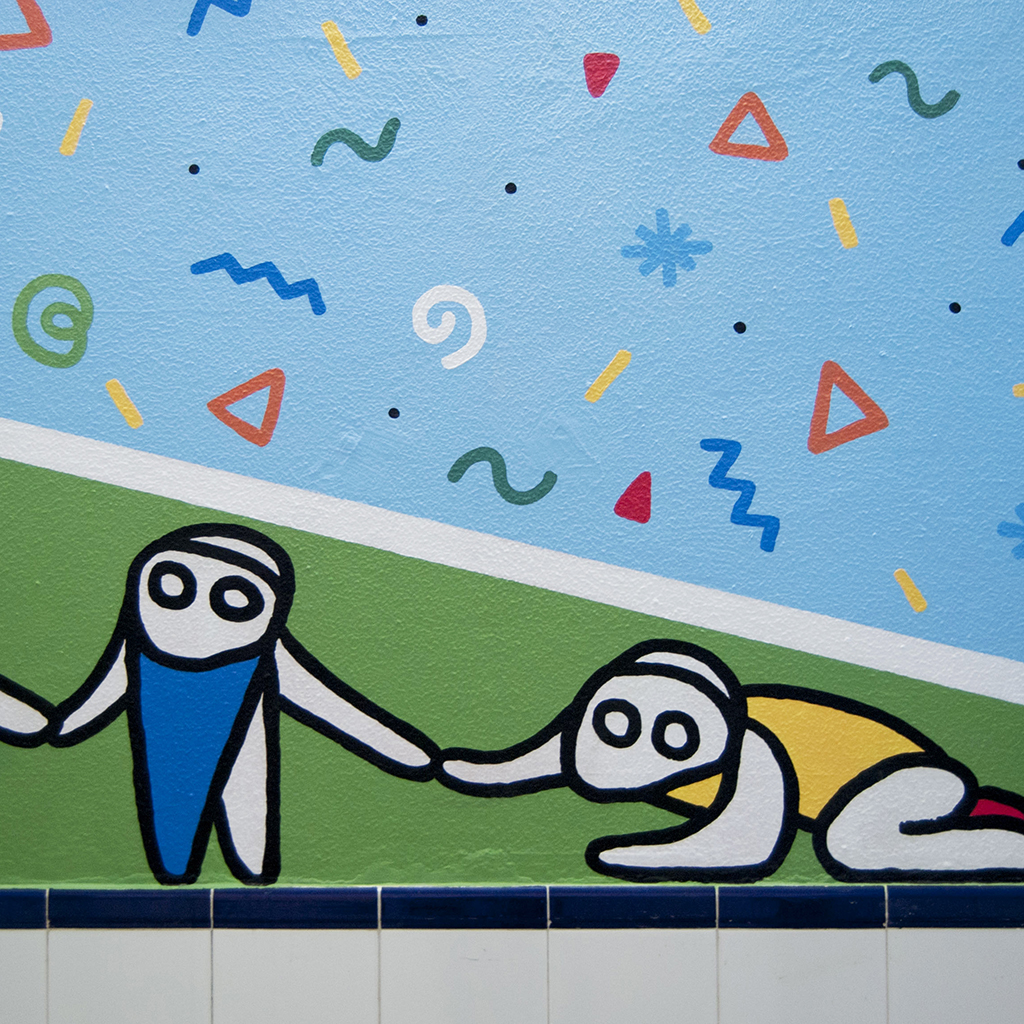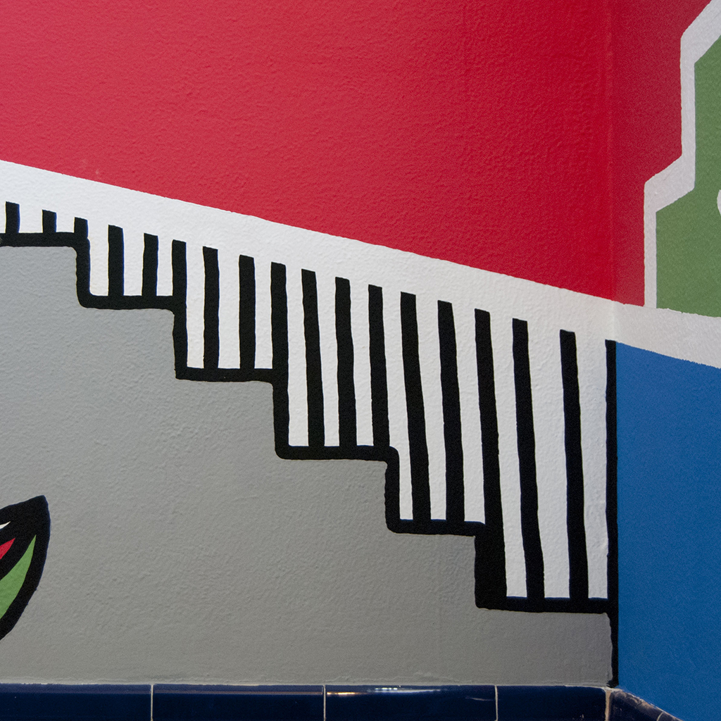 Para este mural, escogimos la palabra cariñito (en referencia a esta cumbia), y colocamos cada una de sus letras en un cubículo diferente. Simplificándolas construimos el fondo en formas de colores planos, que más tarde se convirtieron en las viñetas de un cómic, en el que se narran historias de afecto, abrazos y su búsqueda.