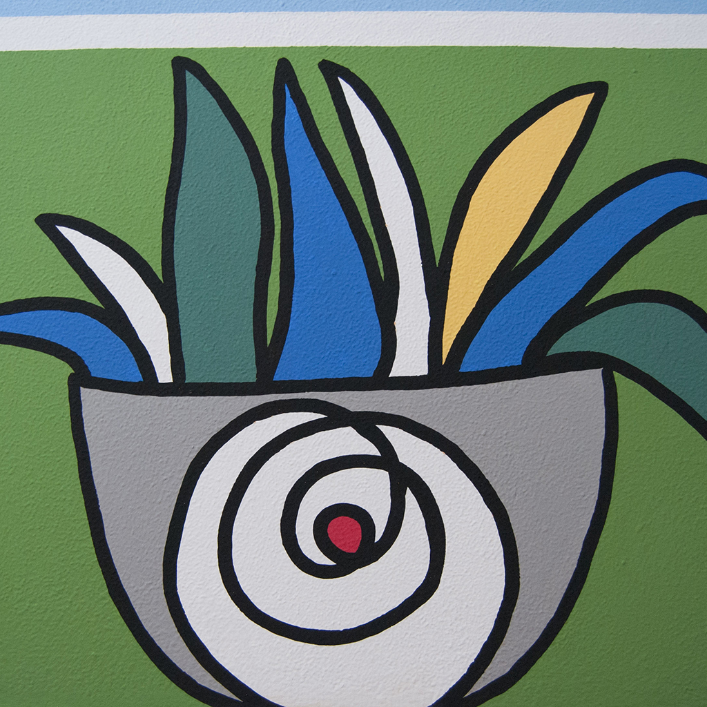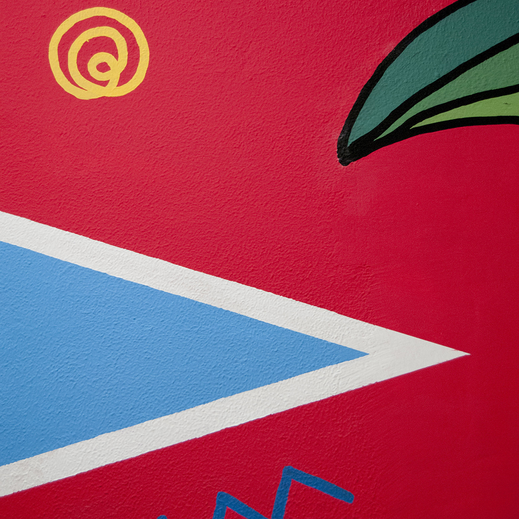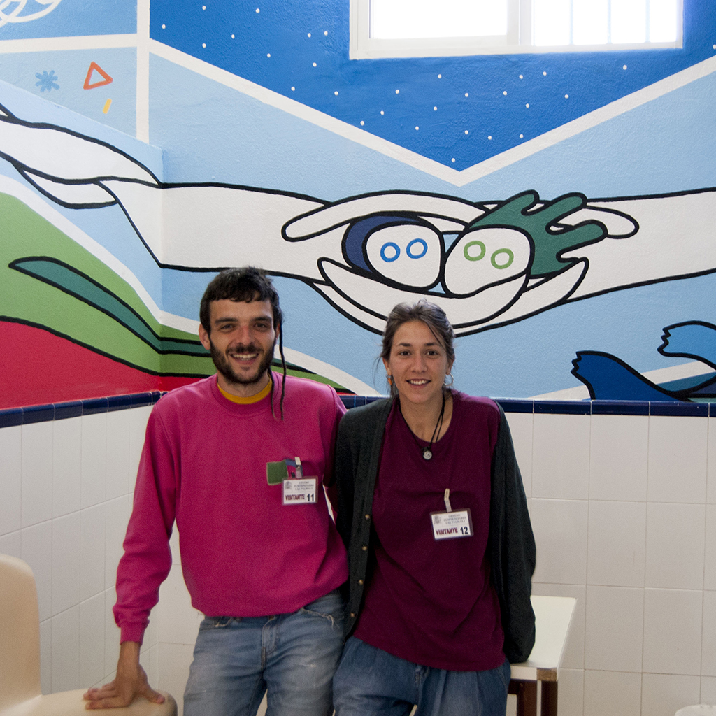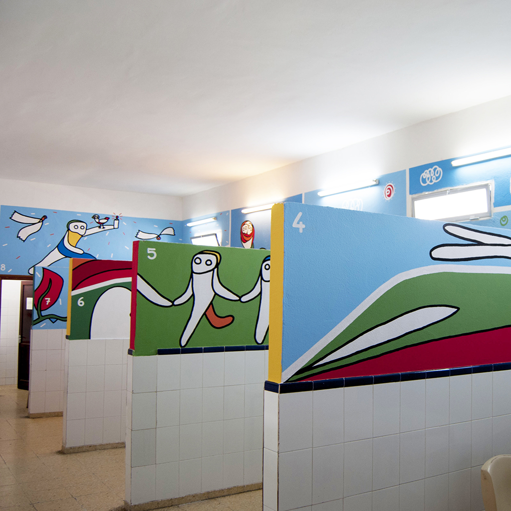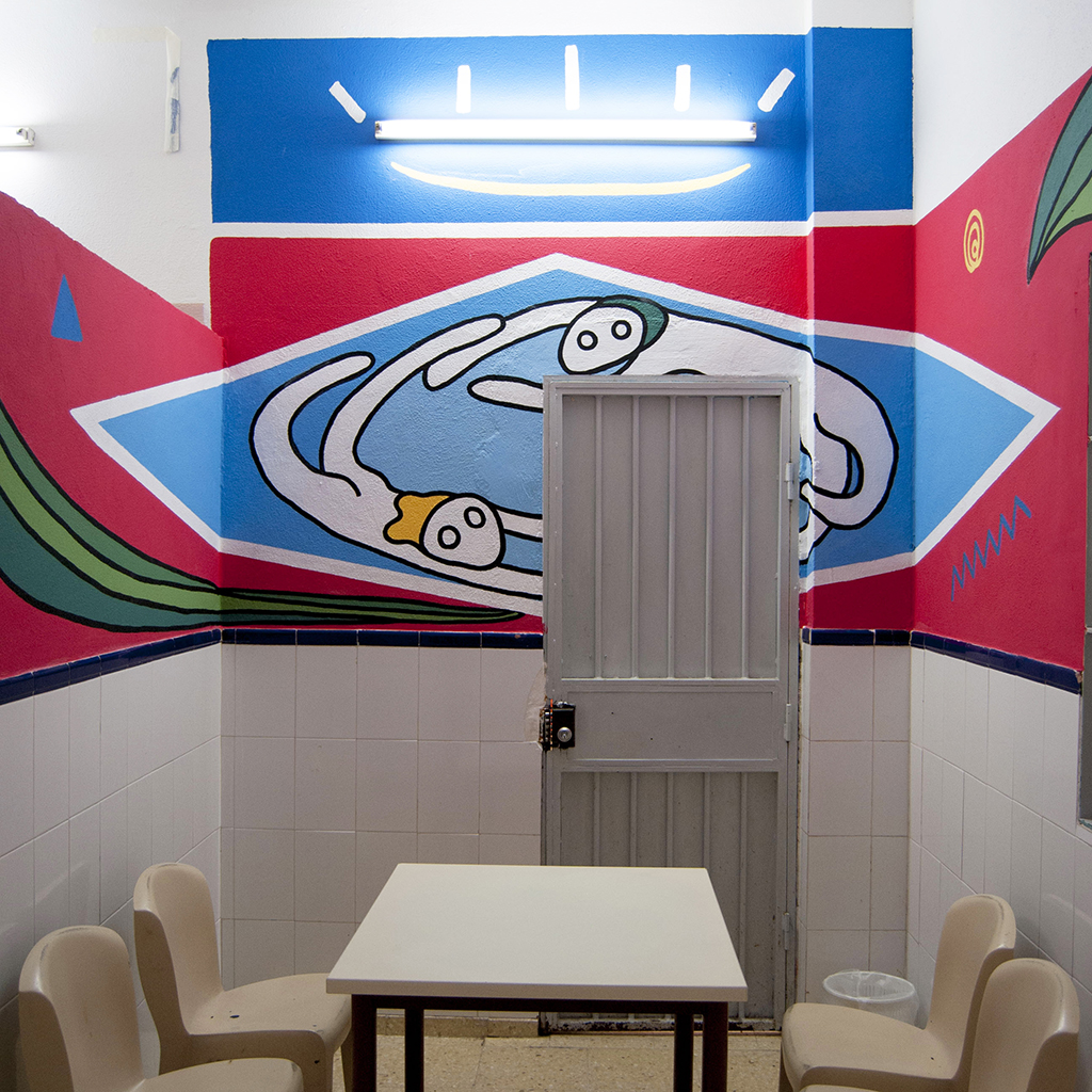 Este proyecto lo realicé de junto a Marta Gonzalez Sacristán (Ma.go.sa) para el centro penitenciario de El salto del Negro, en Gran Canaria. Teníamos que pintar la sala de comunicaciones, donde los internos se encuentran con sus familias. Son espacios súper delicados y con un montón de cargas y situaciones diferentes, así que buscamos proyectar solo cosas positivas generando un lugar más agradable, basado en el cariño y el cuidado.