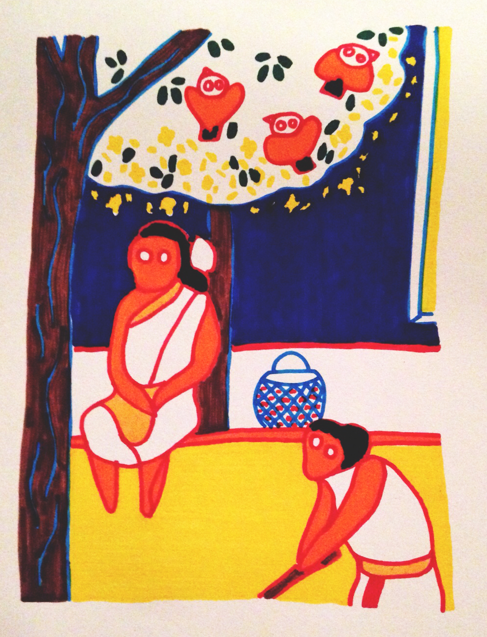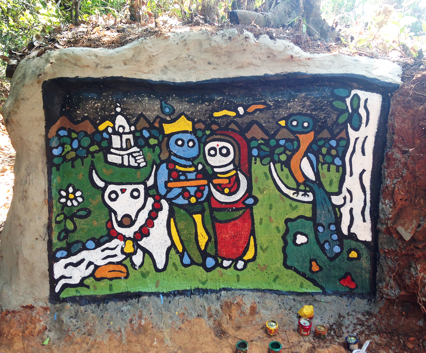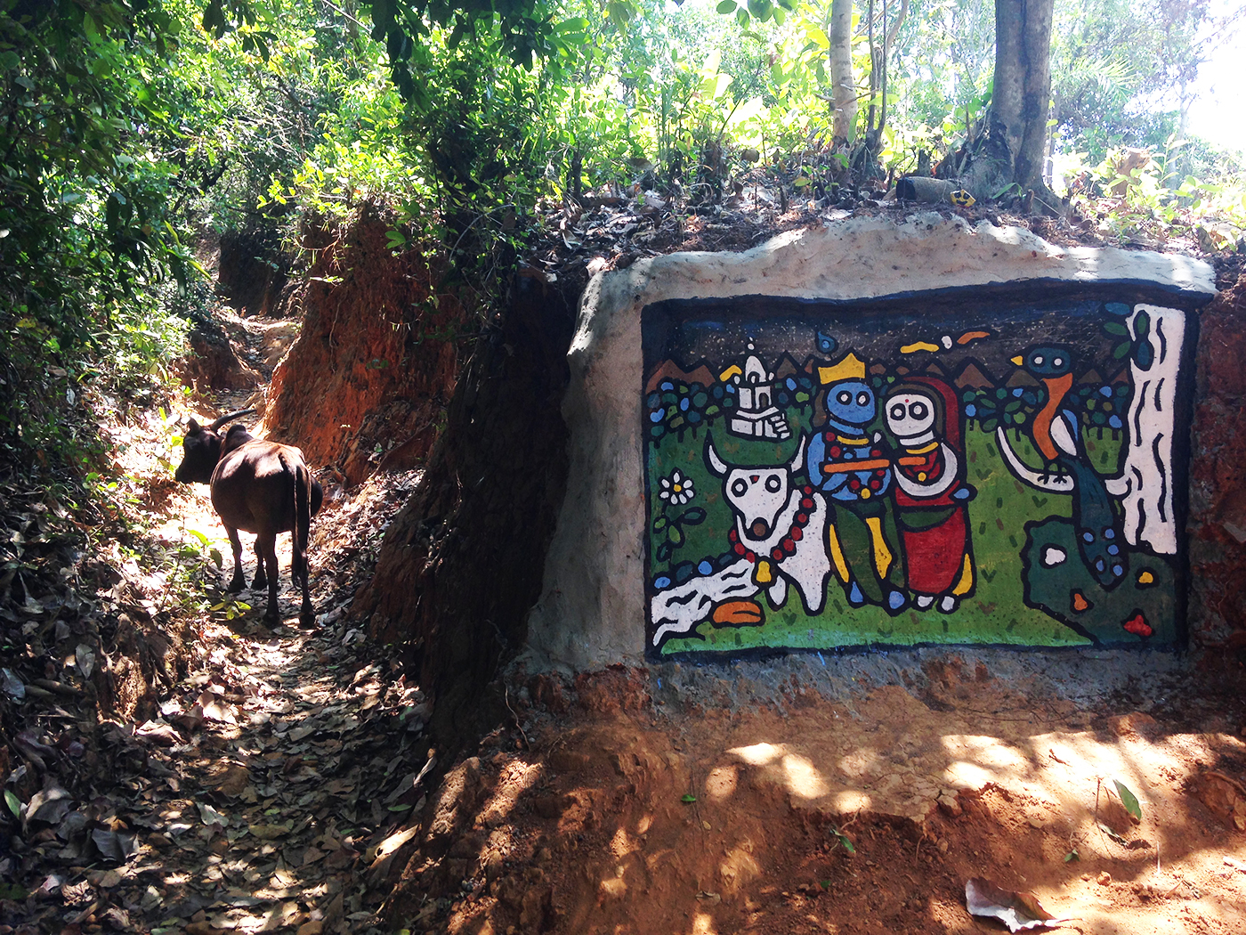 En Gokarna, recibí un encargo. Me pidieron representar a Krishna y Rama, con el templo, el toro blanco y el pavo real. A través de diferentes estampitas de arte tradicional que me enseñaron, reconstruí este paisaje de un encuentro entre dioses, en la orilla de un camino, en plena naturaleza.