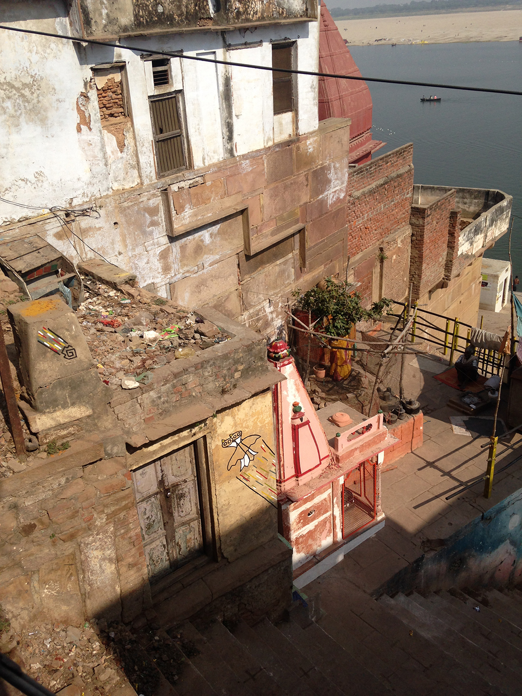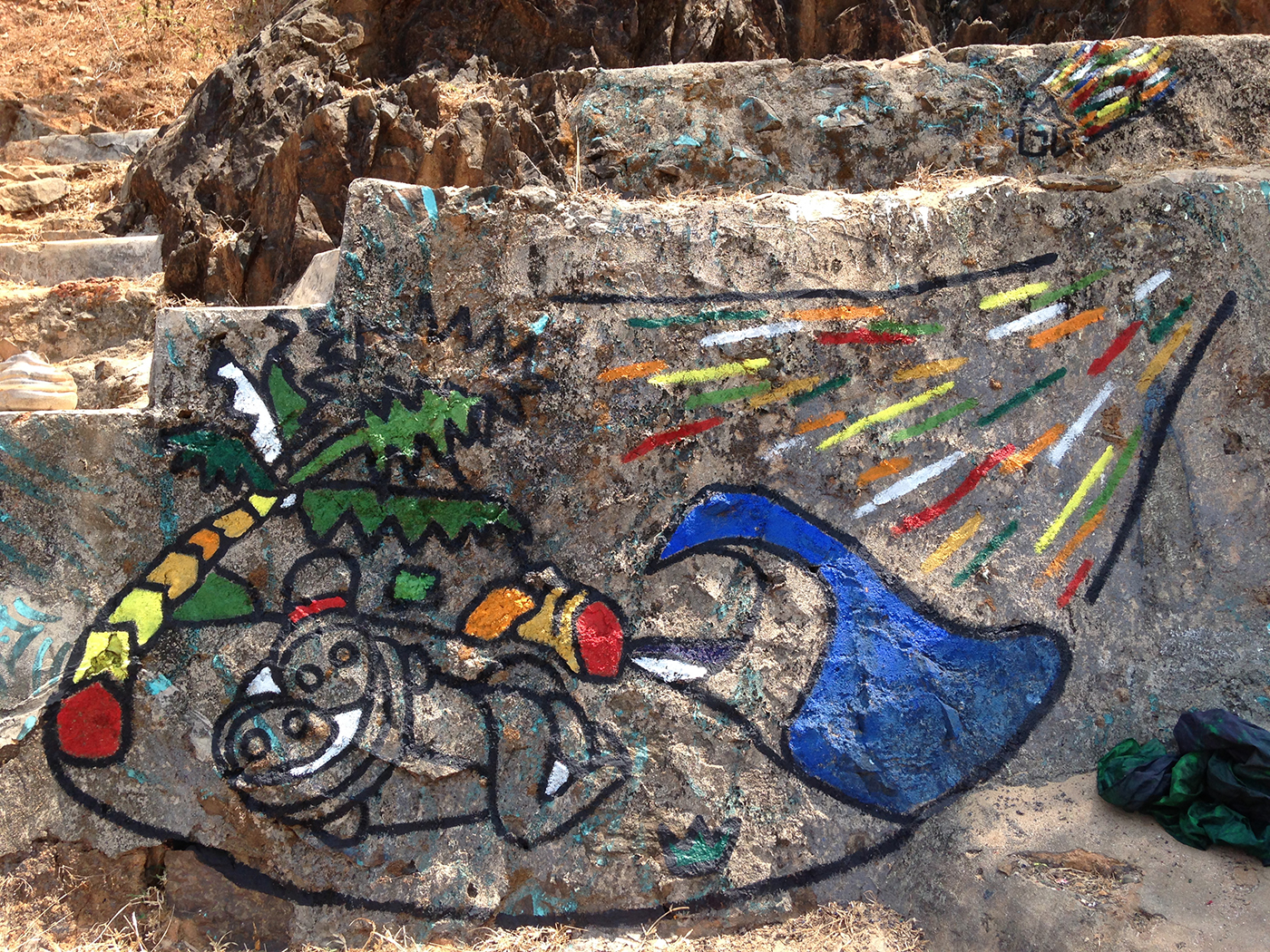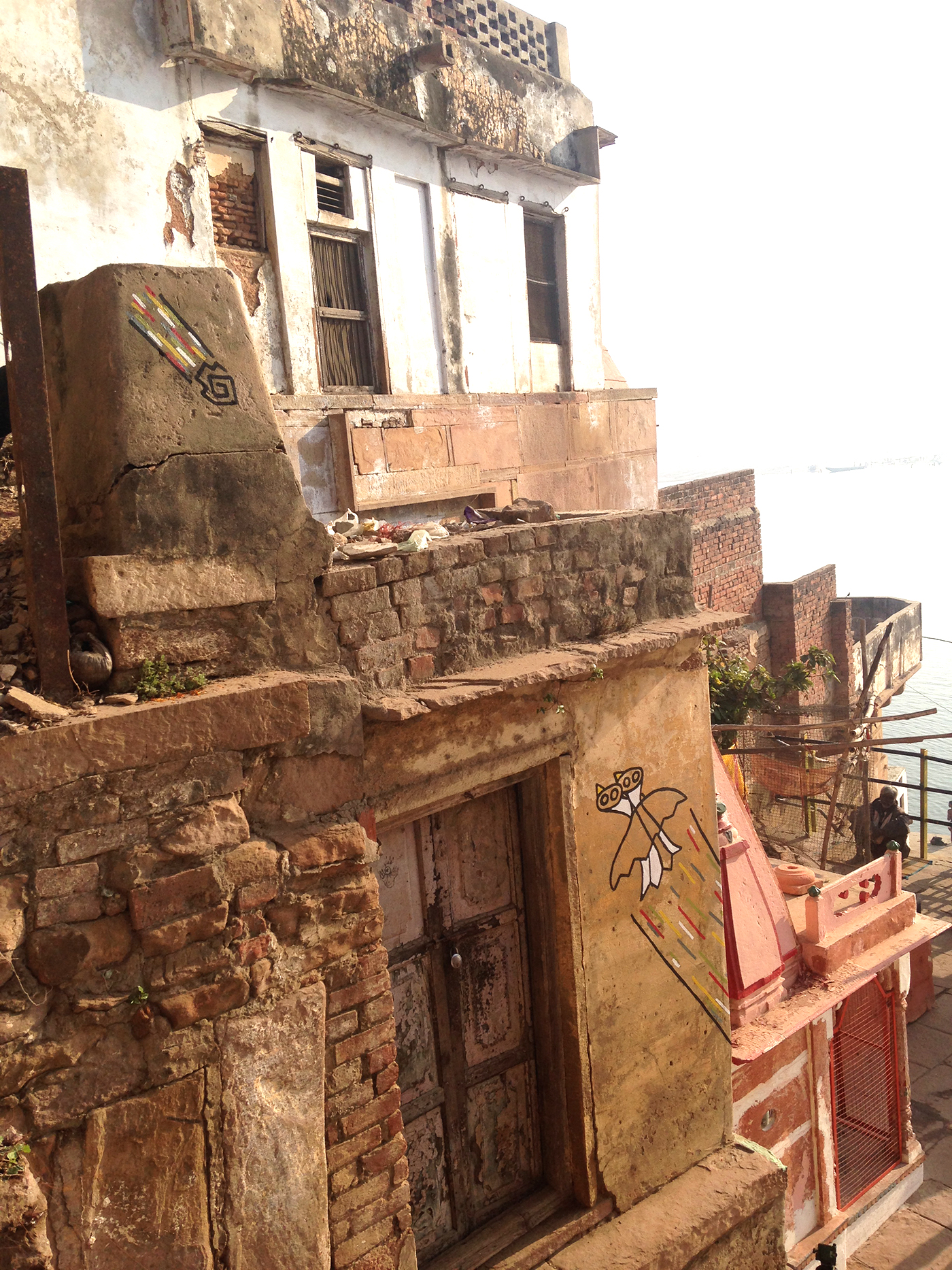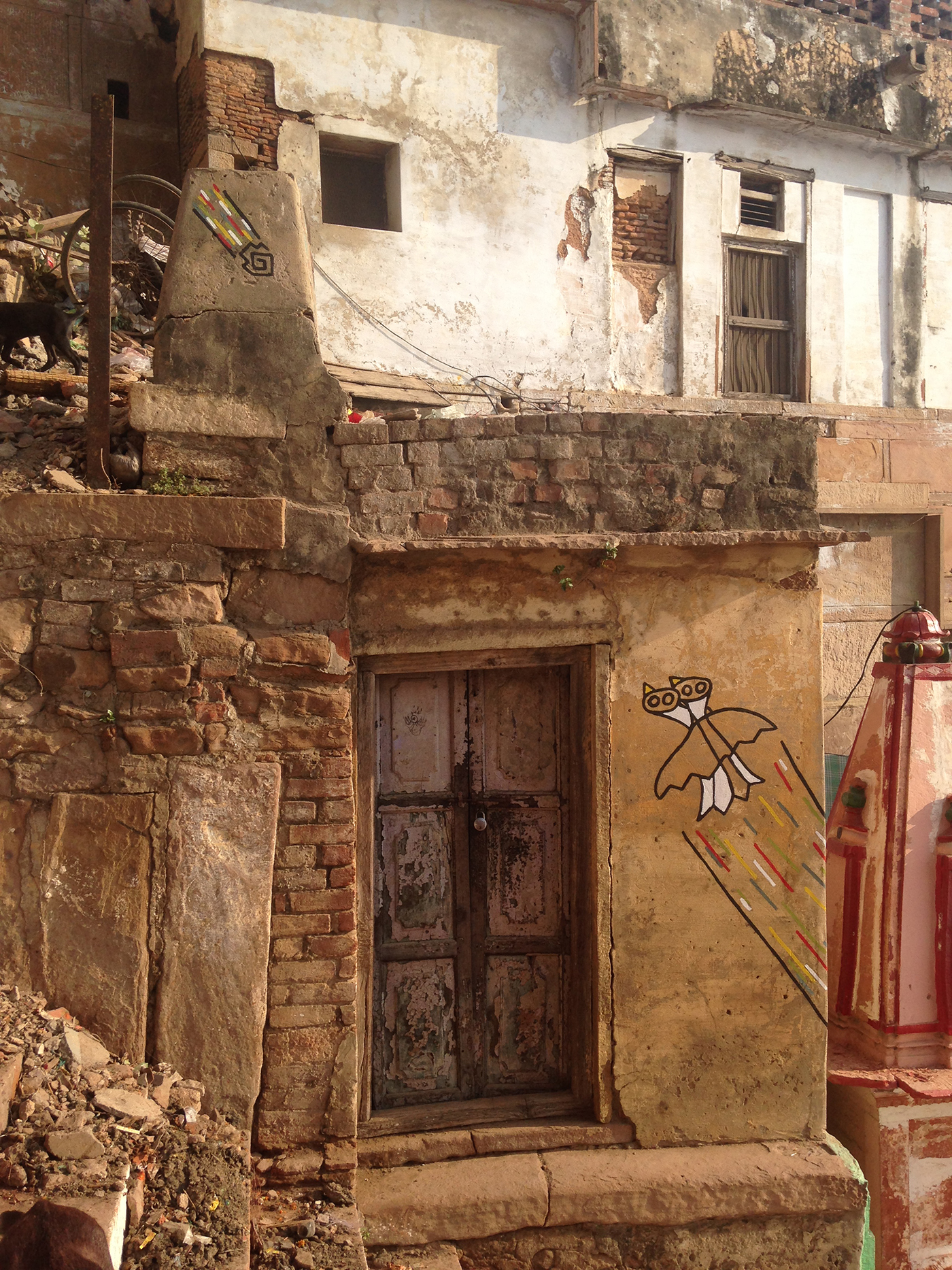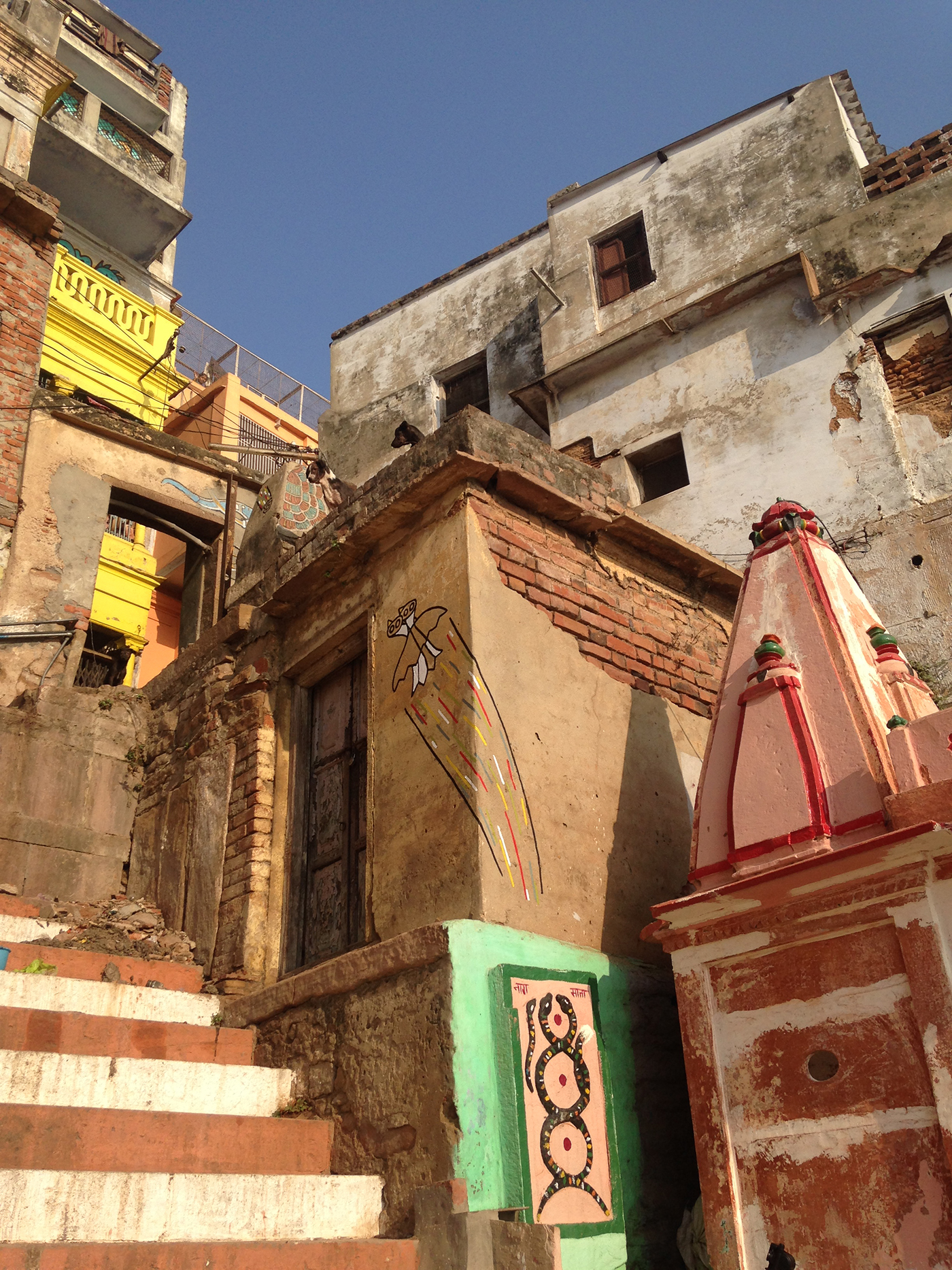 En Venarés, en los mismos gates del río Ganges, realicé esta intervención, en la que un pájaro de 2 cabezas vuela hacia arriba, escapando de dos serpientes enlazadas, mientras un meteorito cae.