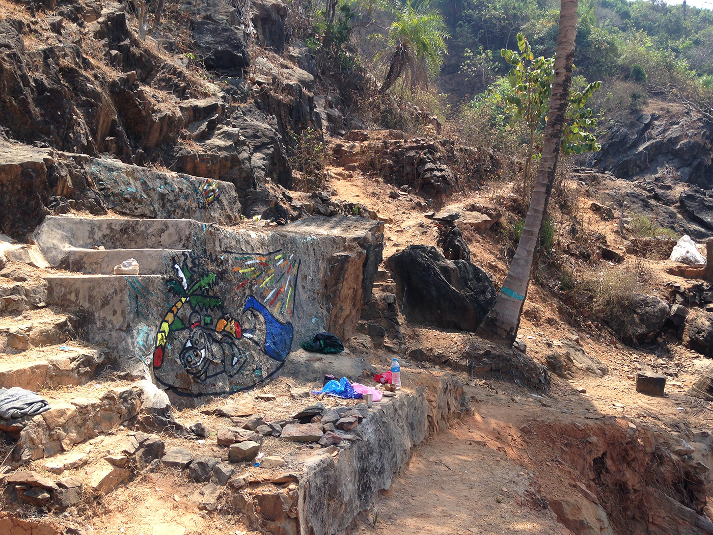 En aquella misma zona de Gokarna, se encontraba Paradise Beach. Un lugar con placton luminiscente, apartado de grandes núcleos urbanos, donde la gente solía quedarse de acampada algunas noches y eso hicimos. En este sitio encontré un muro artificial y puse en marcha la idea de paraísos portátiles que andaba rondándome la cabeza bastánte durante el viaje, junto a las piedras, los meteoritos, el sol y la luna simultáneos, la conexión del mundo entero, las burbujas…